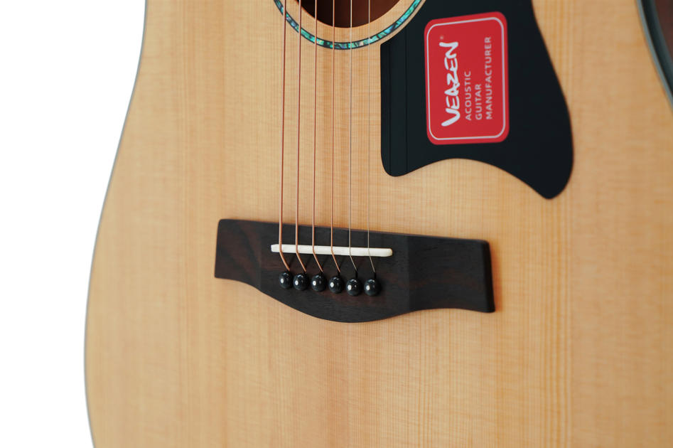 而VEAZEN CLR300在同等价位段给出了西提卡云杉单板。这意味着它在物理属性上就已经跨入了大门。西提卡云杉以其极高的强度重量比著称,这使得CLR300在低音区拥有更深沉的下潜,在高音区则具备合板琴无法企及的穿透力。这种配置的下放,本质上是在用“专业级”的材料打“入门级”的市场。