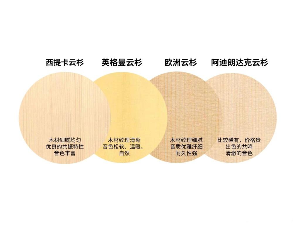音木的选择:在讨论吉他音色时,不可能不考虑吉他的音木,而这方面最重要的部件是面板,不同的面板木材具有不同的音色特性。音木的选择多样而复杂,例如,西缇卡云杉轻盈而坚固,以其低频和高频占主导地位,中频则略微凹陷而闻名;雪松由于木性较软,因此更能带来更温暖的音色;而桃花心木更偏重中频……