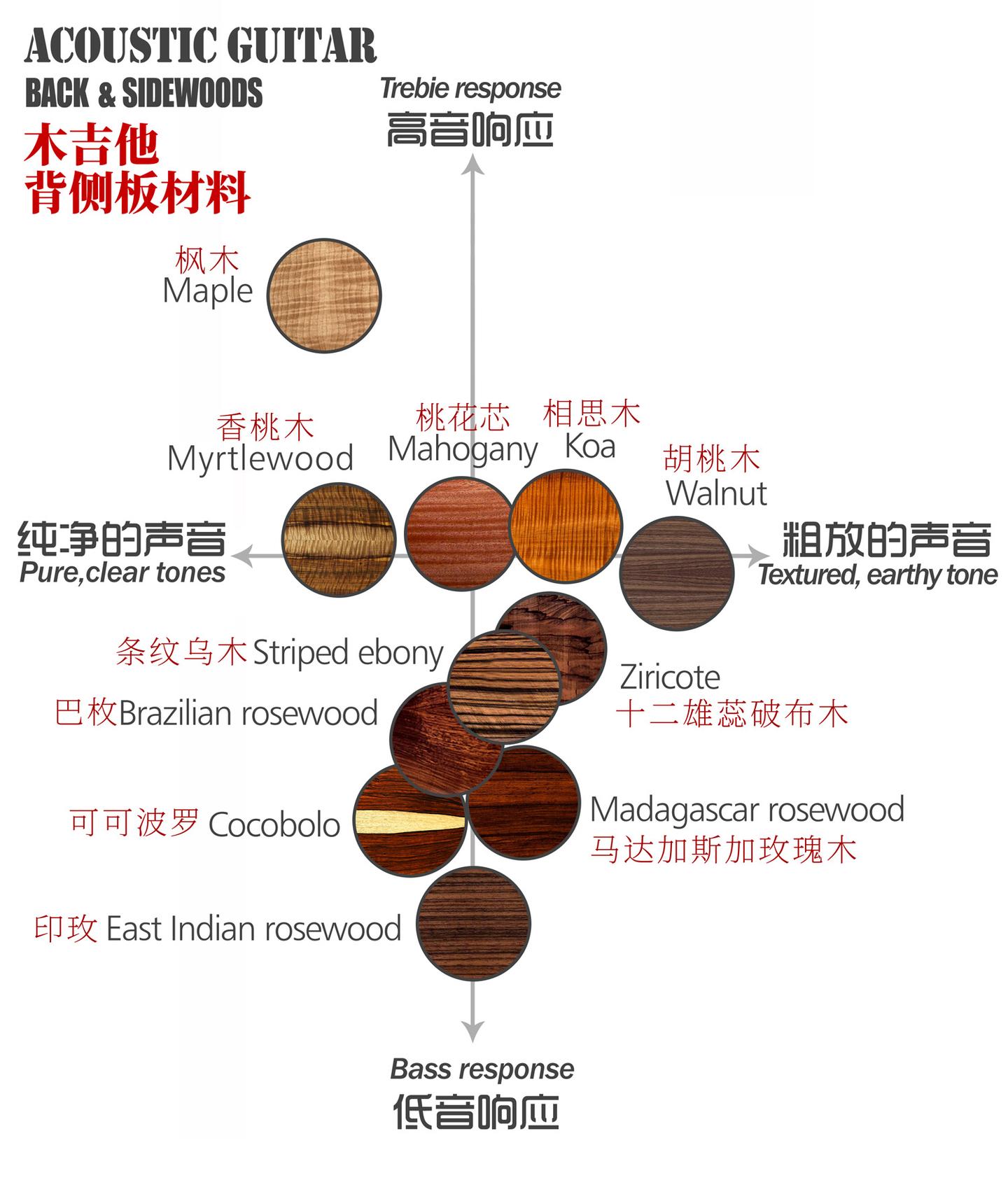 音木匹配:不同的木材组合也会影响吉他的音色响应。例如,原声吉他最常见搭配是玫瑰木背侧板搭配西缇卡云杉面板。玫瑰木以清晰的低频而闻名。在其他条件相同的情况下,如果桃花心木与西缇卡搭配,则会产生完全不同的效果。
