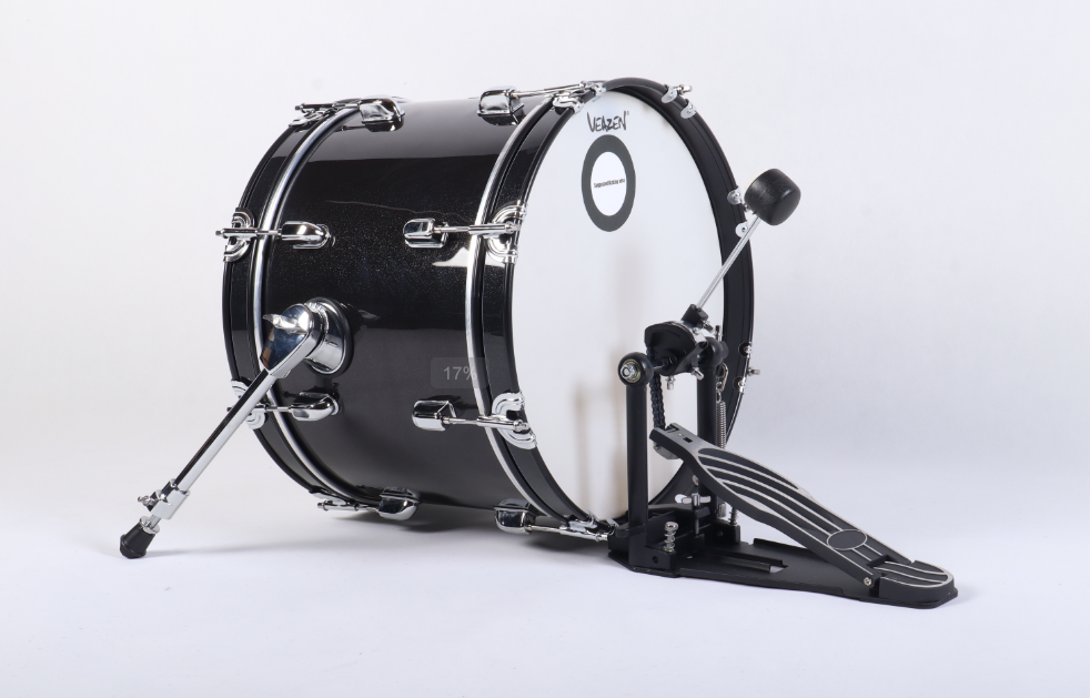 针对底鼓共振难题,VEAZEN费森进行了深度的物理架构优化。在PD20/PD30型号上,我们采用了大面积高密度吸震网面与防滑减震底盘设计。而在旗舰型号PD50上,更是毫不妥协地引入了 16英寸落地木质真鼓腔底鼓。这种原声级木腔结构不仅提供了极其扎实沉稳的机械踏板反馈,更利用木材的天然声学特性,有效吸收和缓冲了踩踏瞬间的瞬态冲击力。